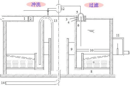 上图的右半部表示过滤时的情况:经过澄清的水由进水槽1流入滤池上部的配水槽2。经虹吸管3流入单元滤池的进水槽4,再经过进水堰5(调节单元滤池的进水量)和布水管6流入滤池。水经过滤层7和配水系统8而流入清水槽9,再经出水管10流入出水井11,通过控制堰流出滤池。