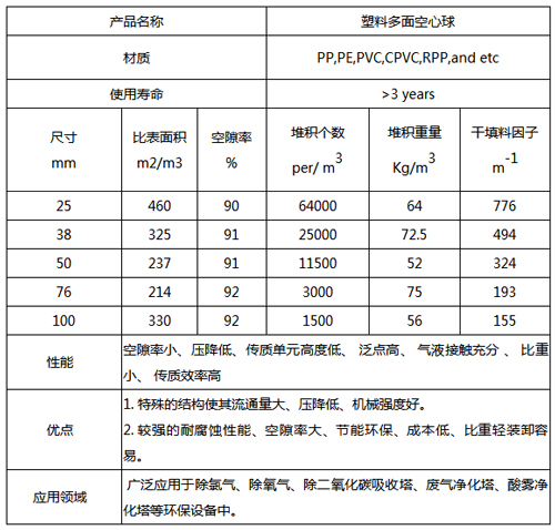 多面空心球采用聚丙烯(PP)塑料制成球状,由两个半球合成一个球形,每个半球上根据设计需要有8-12个半扇形叶片,两个半球的扇形叶片相互错开。上下球瓣互相交错,沿中心轴呈放射形布置,由于表面积大;传质效率高、且重量轻、强度大、安装方便、自由空间大,耐高温,耐腐蚀,表面亲水性能好,风阻小,叶片多,气速高(在140℃的环境中不变形),因此多面空心球在废气净化、脱硫、脱二氧化碳气体、废水处理等行业中得到广泛应用,多面空心球设计先进,结构合理,性能稳定,使用效果理想,全湿比表面积大且适用于多种环保处理设备中。