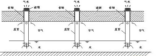 长柄滤头和滤板组成一套配水配气系统,属于小阻力配水系统。长柄滤头由上部滤帽和下部直管组成。每只滤帽上开有多条缝隙,缝隙在0.5μm~0.25mm之间,视滤料粒径决定。直管上部设有小孔,下部有一条缝隙。安装前,就把套管预先埋入滤板内。长柄滤头采用ABS工程塑料(或不锈钢)制造。当气-水反冲洗时,在滤板下面的空间内,上部为气,形成气垫,下部为水。气垫厚度大小与气压有关。气压愈大,气垫厚度愈大。气垫中的空气先由直管上部小孔进入滤头,气量加大后,气垫厚度相应增大,部分空气由直管下部的直缝上部进入滤头,此时气垫厚度基本停止增大。反冲水则由滤柄下端及缝上部进入滤头,气和水在滤头内充分混合后,经滤帽缝隙均匀喷出,使滤层得到均匀反冲。滤头布置数一般为48~60个/m2.开孔比约1.5%左右。