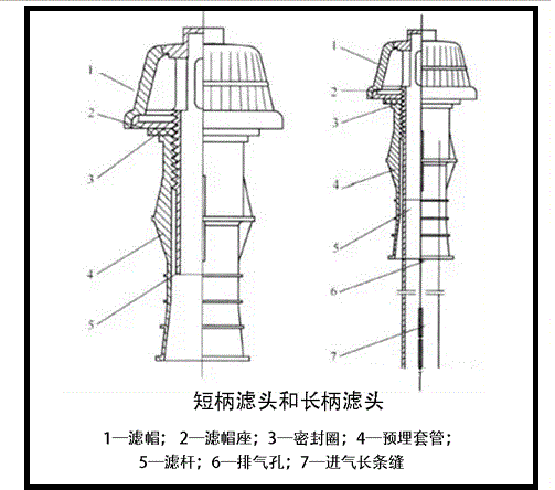 长柄滤头和滤板组成一套配水配气系统,属于小阻力配水系统。长柄滤头由上部滤帽和下部直管组成。每只滤帽上开有多条缝隙,缝隙在0.5μm~0.25mm之间,视滤料...