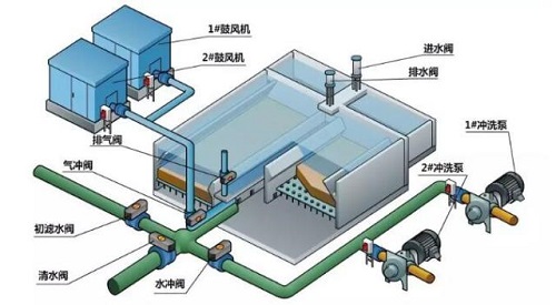 滤池中间位双层中央渠道,将滤池分为左右两格,渠道上层是排水渠,供冲洗排污用;下层是清水渠,过滤时汇集滤后清水,冲洗时分配气和水。