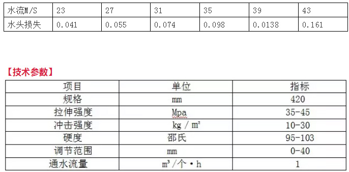 单纯用水反冲洗是滤头的水损失不大于下表值。