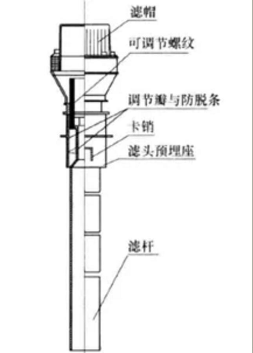 三步,滤板养护完毕后 ,摘去施工盖,将滤杆旋入预埋座中,向滤池布水区注水至要求高度,一般至预埋座内螺纹上平,作为滤杆调节基准,用专用工具调节滤杆,使其上端平面与布水区水平面同一水平高度;